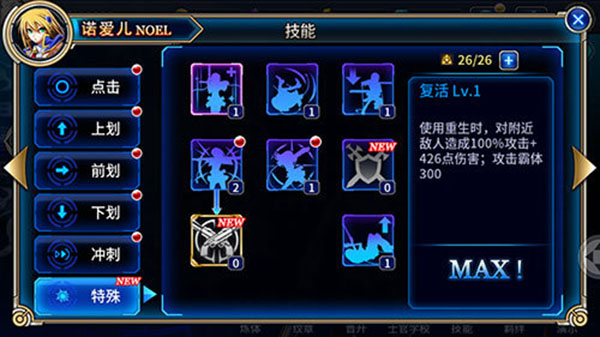 玩诺爱尔角色时,玩家除了练体其他最好点满。诺爱尔的羁绊是白面加攻,松鼠加血,男主两个对半加。由于前期技能点急缺,而羁绊加成是对应其人物的相应属性,所以羁绊等级要跟上,装备强化也要跟上,纹章应升到相应属性(前期资源急缺特别是金币)。比如白面加诺艾尔攻击,那么纹章点魔素(按着不动自动升,经验瓶也一样),装备紫装就可以开始强化了。而以后直接在强化中喂给橙装,可以完美继承强化等级。在其中,强化金币消耗巨大,所以,建议前面有条件vip礼包金币务必要买哦。