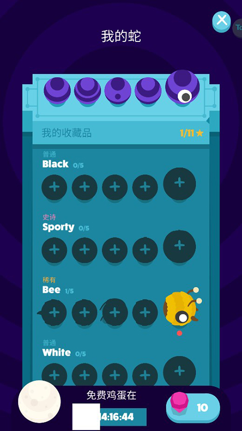 5、游戏还可以进行小蛇皮肤的收集,可以使用红宝石解锁,也可以打开下方免费鸡蛋进行解锁,鸡蛋有时间限制,也可以使用红宝石直接购买鸡蛋。