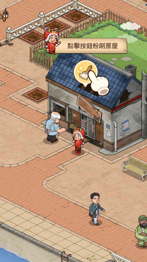 2、玩家需跟随引导点击操作,首先点击按钮粉刷房屋;
