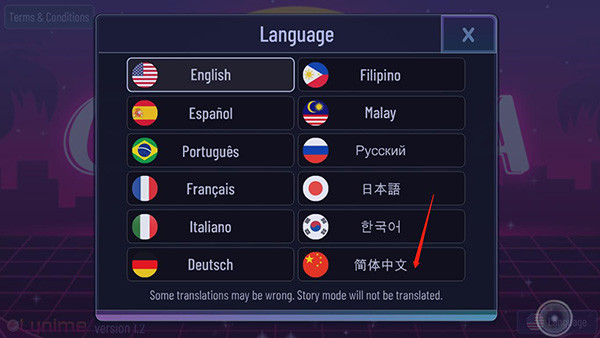 1、下载进入加查超越游戏,游戏默认是英文状态的,我们先设置中文,点击右下角按钮;