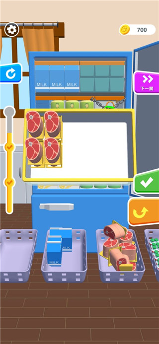 6、越到后面关卡越难,玩家需要合理的利用冰箱中的隔成将物品进行摆放。