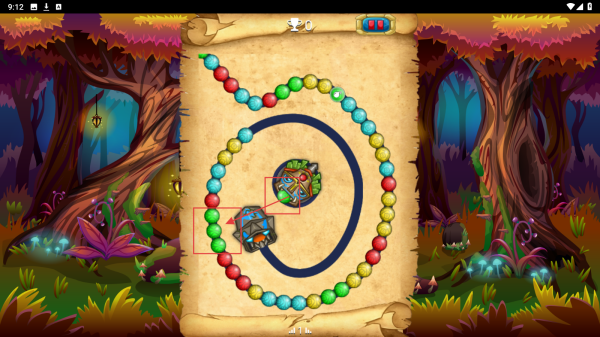 1、观察轨道上同色珠子分布,瞄准发射,尽量让同色珠子相连,触发消除。