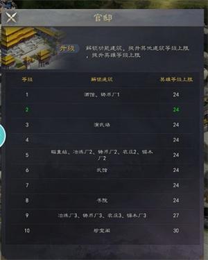 2、游戏初期不需要大肆招揽军队,只需将精力放在升级官邸上用来提高官邸等级,解锁更多功能,玩法多了,获得资源的方式才多。