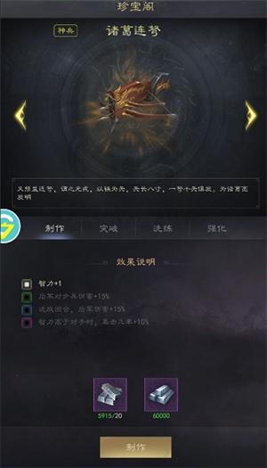4、珍宝阁内可以打造各种强大的神兵,玩家可以去查看武器需要的材料,收集好后前去打造,强化自己军队的战斗力。