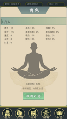 点击修炼角色图片可以进入角色详情界面,在角色详情中可以进入设置界面,在设置界面中可以设置音乐、任务执行速度和单次任务执行次数。