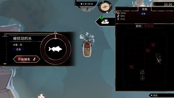 经过一段话之后,你可以点击离港按钮,开始捕鱼。