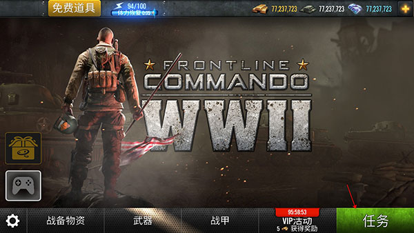 5、教学完后可以看到主界面有物资、武器、战甲等,点击右侧“任务”可开始游戏;