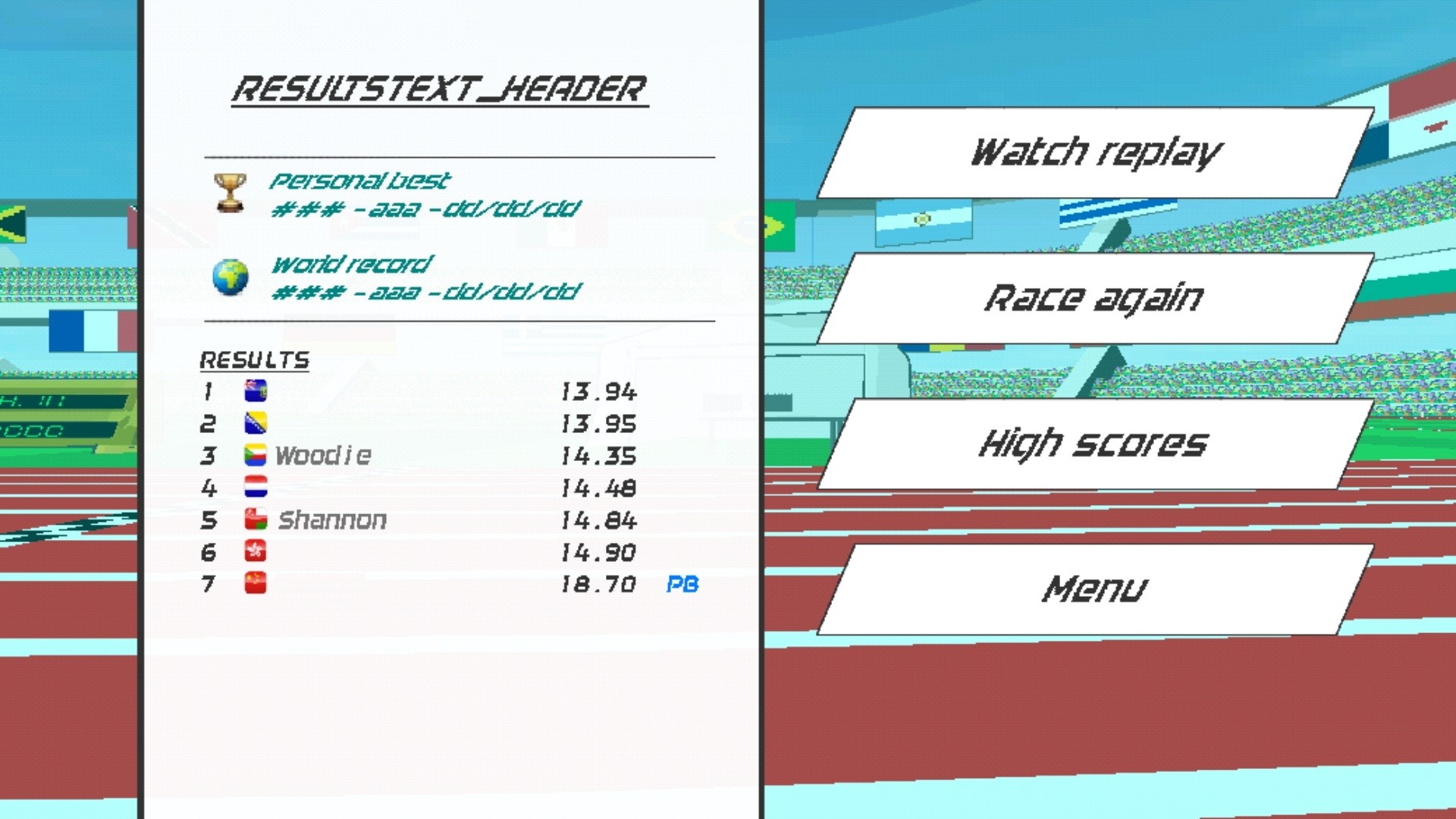 2. 从电影摄像机的角度观看比赛的重播,并从8个丰富多彩的预设中选择体育场主题,200米、400米、60米、110米栏和400米栏。