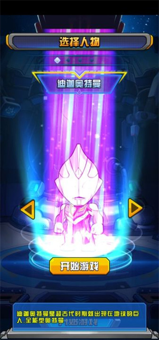 2、开始选择自己喜欢的人物,点击两边三角可以换人物,在下面也有每个奥特曼的介绍。