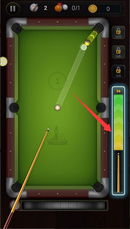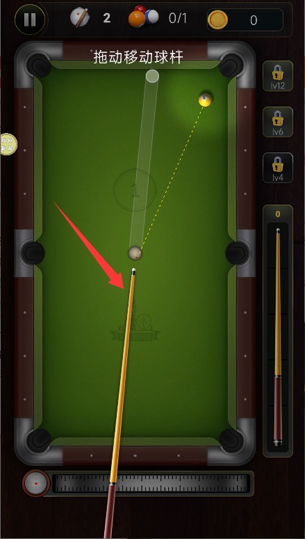 1、进入游戏后通过拖动屏幕调整球杆位置,寻找最佳击球角度与行进路线。