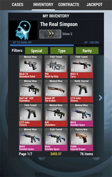 市场:可购任意品质武器或刀,能按名搜皮肤或在五类武器中浏览。注意,市场商品贵50%,购买需谨慎。