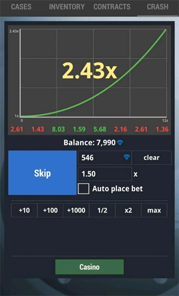 崩溃:玩此游戏可增资金,选下注金额后开始,显示并快速增加下注倍数,可查看游戏历史记录。