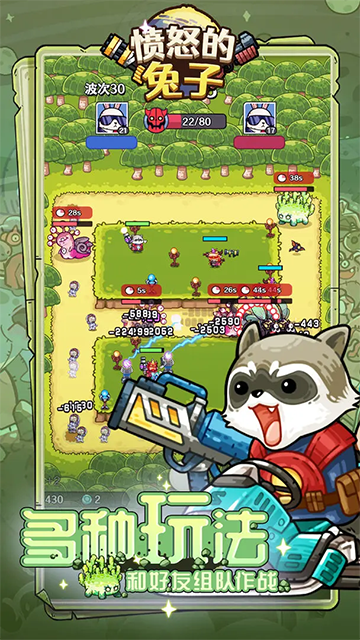 愤怒的兔子手机版游戏画风十分卡通,人物角色Q萌可爱,搭配上欢快的背景音乐,给玩家带来沉浸式的游戏体验。游戏中玩家需要去组建兔子军团,保卫家园的安全,清理外星生物,探索未知的领域,玩起来十分有趣,多种有着不同战斗天赋的特色角色,丰富你的装备、武器库,收获不断变强的养成快乐。