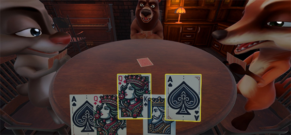 1、游戏开始后,首先玩家翻出一张牌作为底牌,如下图此局为K牌,那么K牌、小丑牌为真牌,其他两张Q牌和A牌为假牌;