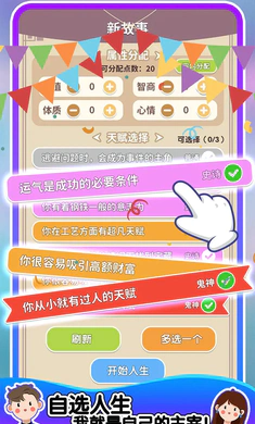 人生轨迹模拟器免广告版是一款深度人生模拟的移动端游戏,让玩家化身为故事主角,自婴儿时期起便踏上充满变数的生命之旅,面对并抉择于各式各样的生活事件,每一次决定都将引领至截然不同的生命篇章与结局。该游戏以丰富的玩法和深度内容著称,旨在为玩家打造一场前所未有的个性化体验之旅。