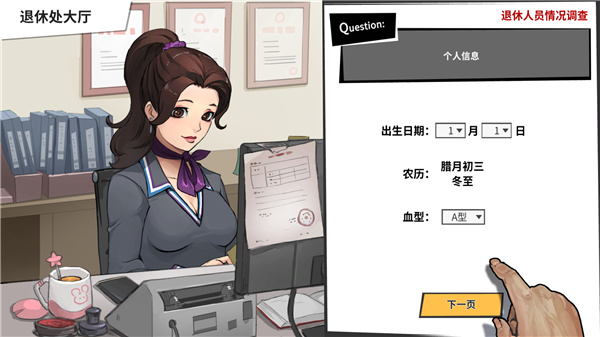 7、进入退休大厅,根据自己的想法,选择各种情况调查问题;