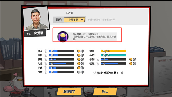 8、当答完10个问题之后会生成一张表格,用户可自定义选择自己的性格标签,以及随机分配自己的属性,不同性格标签会给玩家带来提升不同的属性;