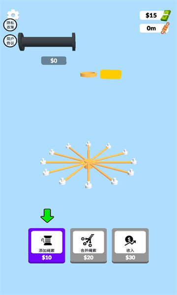 极简主义的增长周期以收集绳索、出售现金和功能升级为核心逻辑,整个过程采用纯点击操作,不需要复杂的策略,玩家只需要反复点击就能实现资产增长。