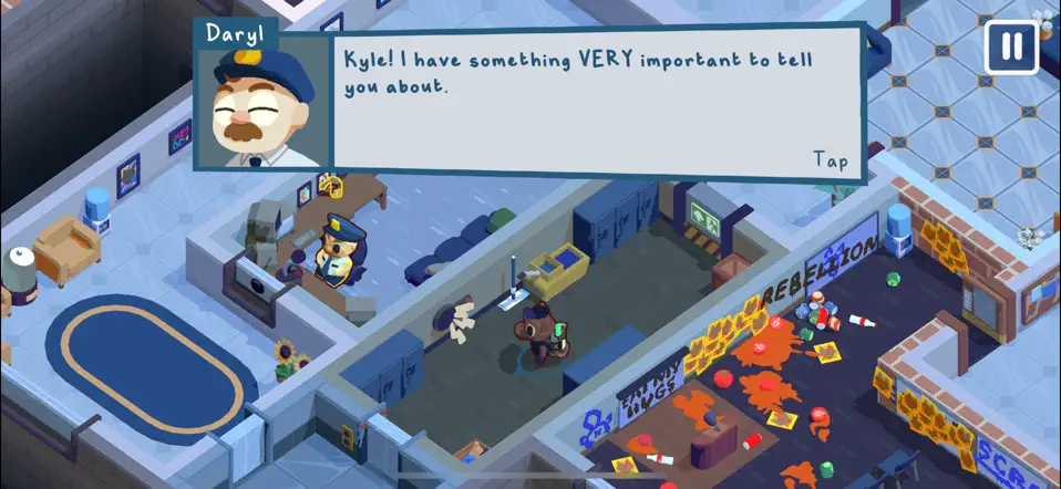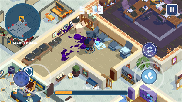 1、可操控角色 Kyle,使用水管等清洁工具,处理各类脏乱场景,包括咖啡机爆炸后的残骸、沾染油漆飞溅的地板、污渍遍布的马桶等。