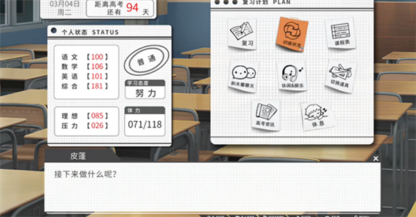 5、能操作的时候都选学习(因为压力很高体力很低,因此学习毫无效率,一模肯定考不好),保持木馨低好感度。