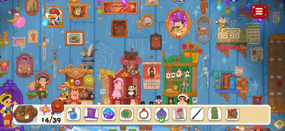 1、寻物解谜:在2D手绘场景中寻找指定物品,每关目标物品数量从3-6个不等,包含“零件”“船员”“日常用品”等,需结合环境互动(如移开石头发现钥匙)。