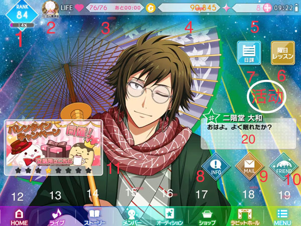 【3】life生命值,打歌时会根据游戏难度消耗一定的生命值,随着你的rank的提升,生命值也会增加。【尚余XXXXX】表示还有多长时间你的生命值可以恢复1。参加活动时有时会获得【奇娜子面包】奖励,使用奇娜子面包会恢复一定的生命值。使用3颗【5】星石生命值可以完全恢复。
