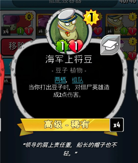 1费,1/1,两栖,组队,豆子标签,当打出其他豆子,它会对僵尸英雄造成2点伤害。