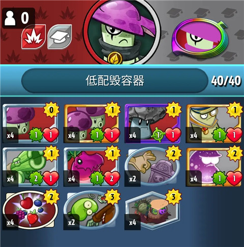 低配毁容器卡组:4小蘑菇+4双人菇+4星际蘑菇+4海军上将豆+4芹菜炮车+4迅猛萝幼苗+2墓碑之误+4宇宙豆+4莓果轰击+2弹簧豆+4莓果星球,共40张卡牌。