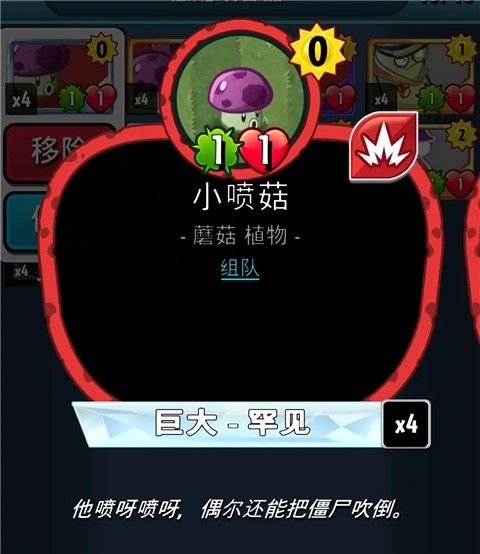 0费,1/1,组队。可以配合星际+星球抽一张牌并打对面一次脸,在费用紧缺的4c/5c会显得更加重要。因为有组队标签,也可以保护后面的植物。
