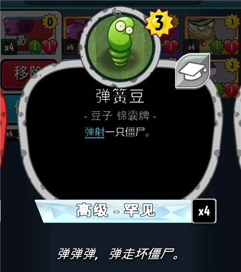 配合上将豆可以弹射对面关键单位的同时打2点伤害。算是一张解牌,也能打乱对面节奏,但对于毁容器来说帮助不大,不如果冻豆。只带2张。