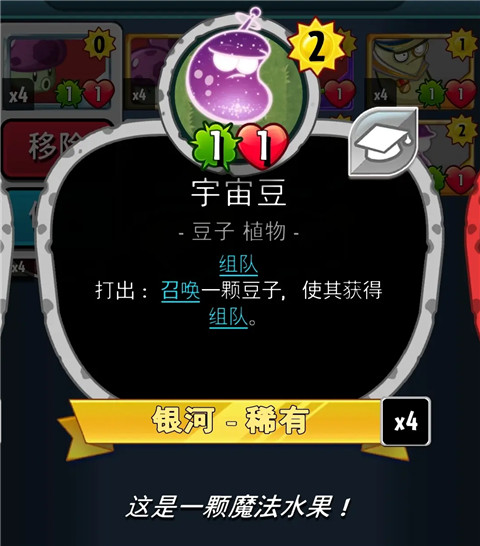 可以保护后面的植物,可以配合上将豆打脸,也可以配合星际+星球抽牌。因为抽的豆子也有组队,一般也不会没地方下植物。抽到的豆子可能会卡手。