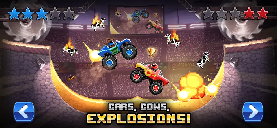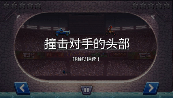 双人撞头赛车的操作都是通过前后两个按钮控制的,只需要点击前进或者后退即可控制小车了~但是千万要小心,这里的车加速过猛是会翻车的,并不是简单的前进后退哦~