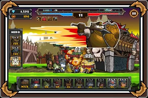 6、为了对抗强悍的魔神,训练猫族战士,雇佣喵星英雄,合理搭配远近兵种、把握时机释放英雄技能消灭敌军,保护好我方营。
