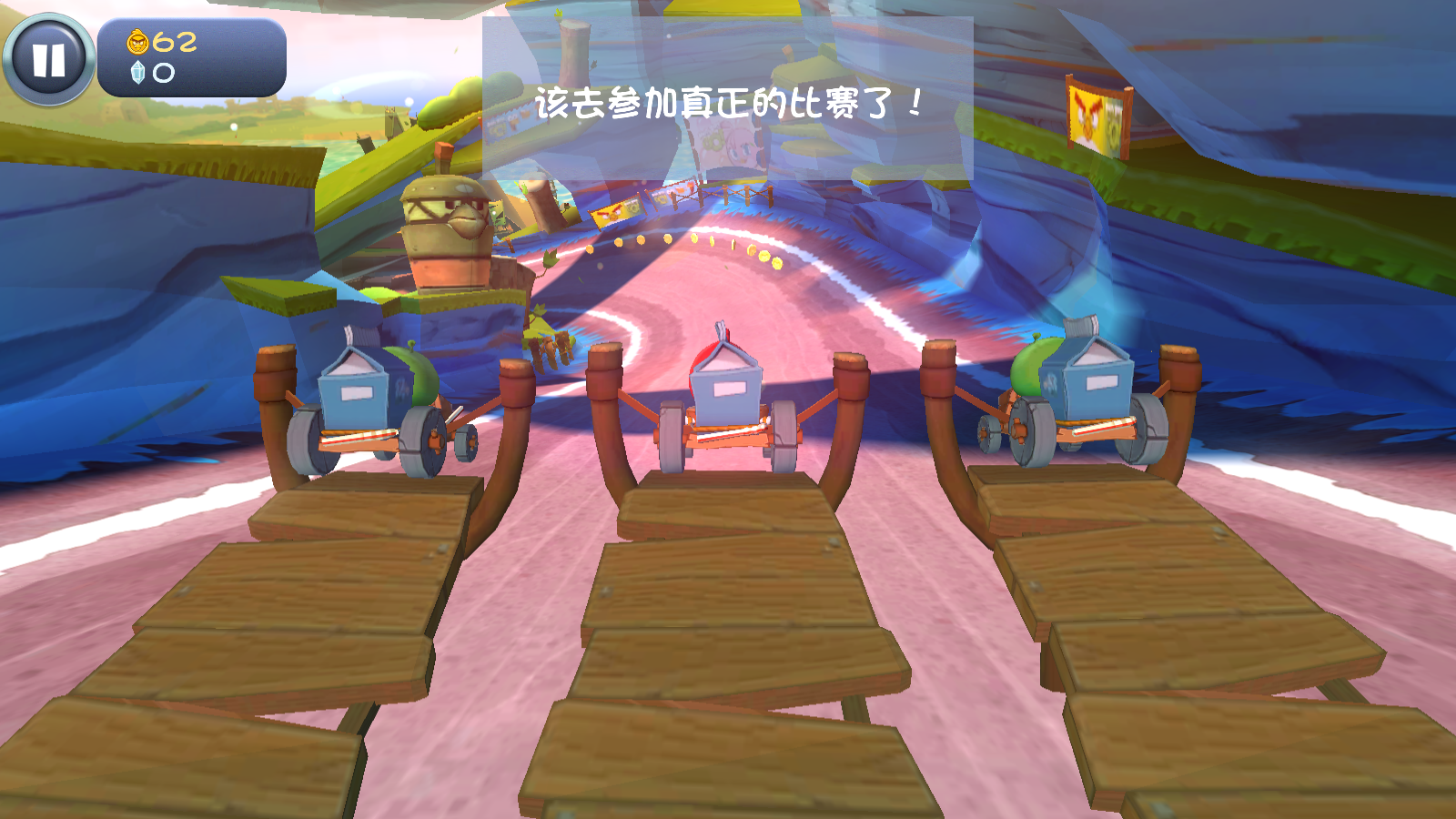 1、进入愤怒的小鸟卡丁车游戏之后,玩家们需要拉动小鸟来开始起步。