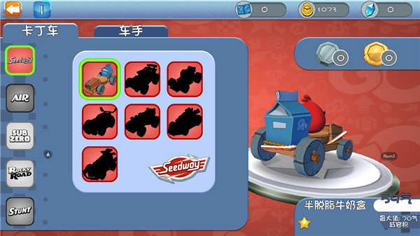 5、而在卡丁车界面,玩家们可以选择并解锁自己喜欢的卡丁车和角色。