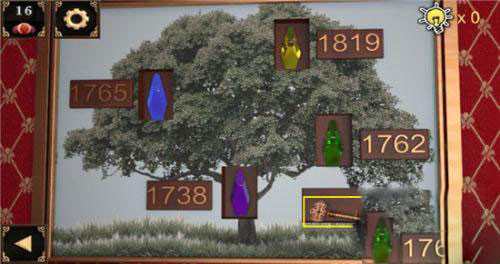 13、来到画像前,我们可以看出其中三个数字是以“17”开头的,唯独一个是“18”,这与独立的黄色有所关联,于是,我们将黄色的宝石放到标有1819的凹槽中,然后很容易地将另外三个宝石归位,从而得到了大门的钥匙。