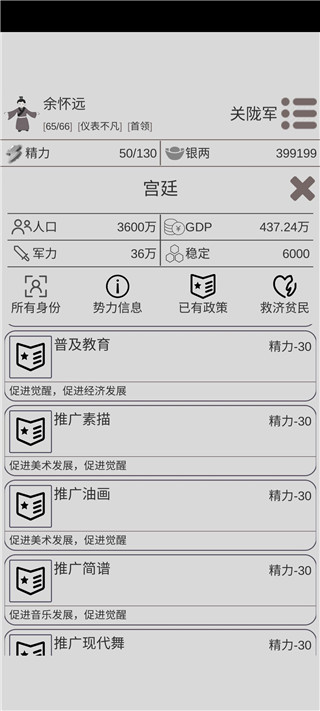 诀窍就是研究艺术,然后去宫廷解锁觉醒相关的政策,比如这些: