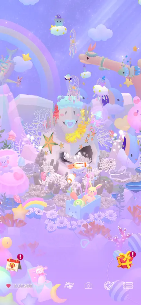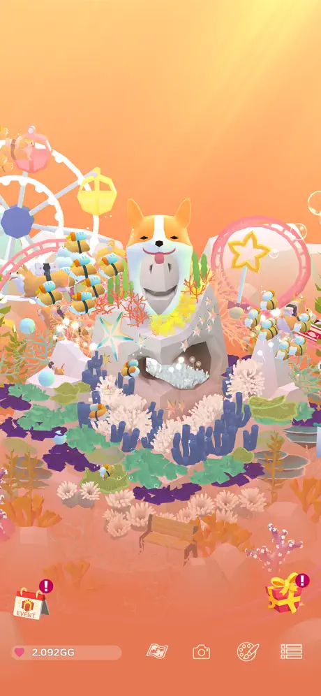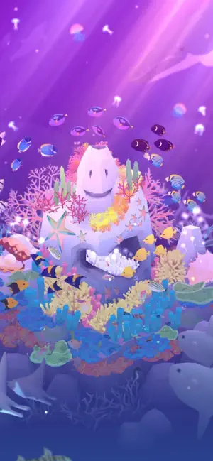 4、我们还可以通过给鱼儿们拍照,完成目标、签到及每日任务,来获得相应奖励。如果不知道做什么,也可以点击右上角奖杯图标,完成任务,成长速度会更快。之后可以根据指引实现扩张,采到新地形,获得宽岩石和海胆,包括篱笆套景。点击神秘箱,会开到【海星】和一些生命额,还有可能是贝壳的饰装。
