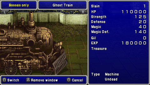 7、魔列车,(他是背后突袭,小心点),他通常会用神圣攻击,但他自己的弱点正好是圣(这里怎么做不解释)。需要小心的是丢轮子攻击,一般会直接把一个HP4000左右的人打残。但这是单体攻击,有时会丢2个轮子,复活是来得及的,在神圣反射下,他110000的HP也不过是个摆设而已。
