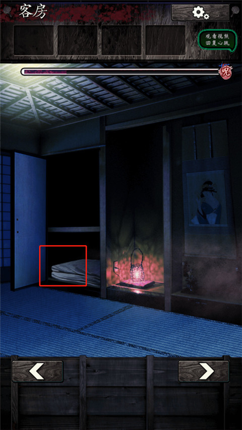 12、然后直接返回卧室,经过一系列对话,本章结束。需要注意的地方只有晚饭之后的那一段,移动拉门时发现打不开了,这时要点击屋子里放在橱柜上的提灯,爬到天花板上面偷听店家的对话(往男主角的饭菜里下安眠药,趁机灭口)。