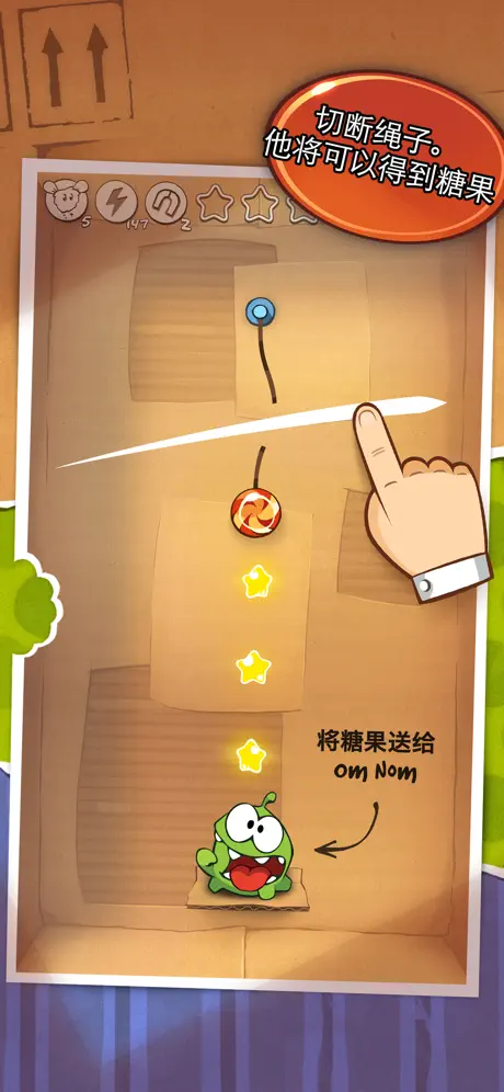 1、割绳子中文版的关卡难度一直都在提升,玩家要做的就是使用手指将绳子全部切断,争取让所有糖果掉入怪物口中。