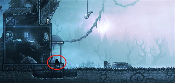 往左走到屋前松动的木板处,连续跳几次让木板断裂,钻入地道进入屋内并获得镰刀。随后打开房门,利用镰刀击杀门外的黑色怪物。