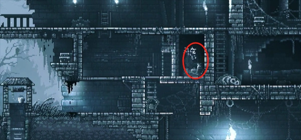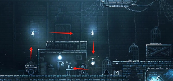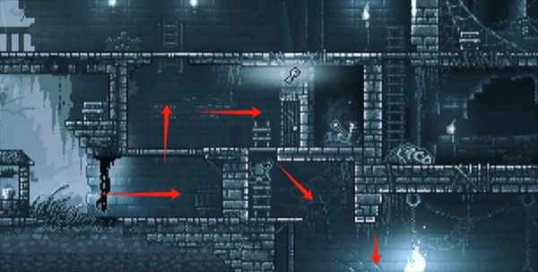 15、遭遇怪物后立即撤退,待怪物越过右侧障碍时,迅速爬上左边梯子并往左跑,一路上爬至顶层,再向右移动,最终将怪物引入尖刺陷阱中消灭。