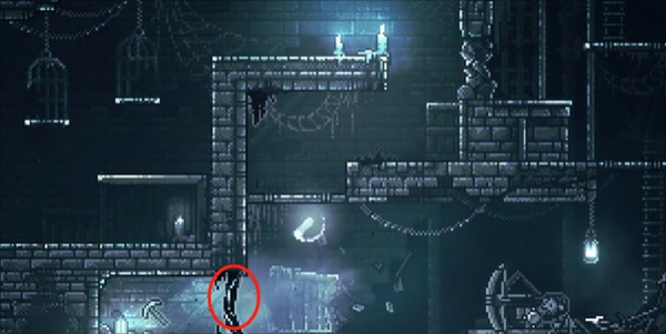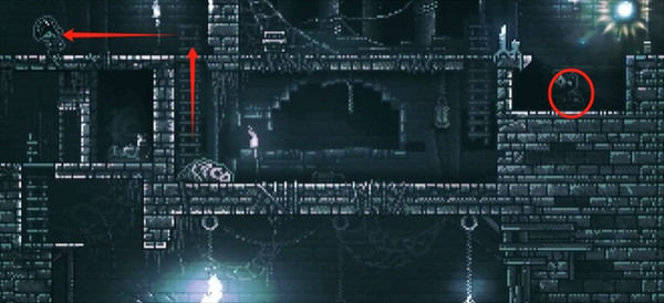 12、登上吊灯右边的平台,柱子断裂后,将之前推倒的柱子推来修复平台,往左跳去获取钥匙。