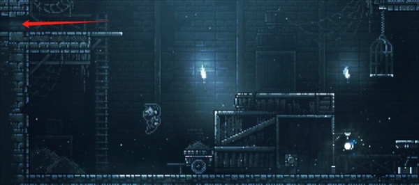5、将推车推到梯子与黑色怪物之间,爬上梯子并跳跃吸引怪物。当怪物跳下后,推车压制怪物完成击杀。继续向右行进,进入笼子区域左侧。