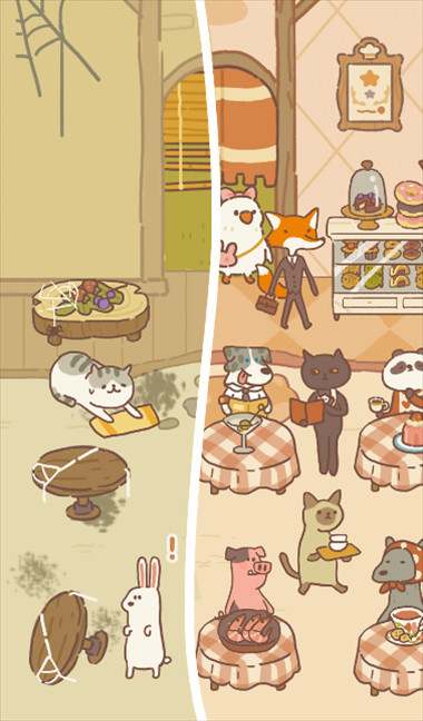1、动物餐厅手机版是很可爱的休闲小游戏,与其说这个是模拟经营,不如说是一个放置挂机,因为没有常见的模拟经营游戏中的对于资源的管理之类的设定,也不太需要调配食客和后厨、菜谱之间的配比,食客的点单厨房不需要任何操作就会自动生成了。