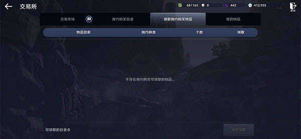 通过预约购买方式购买成功的道具可以通过交易所上方的[领取预约购买物品]中领取。
