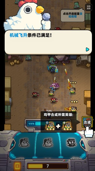 4、拥有三个相同角色时可合并提升等级;当两个三星角色合并时,将生成强力机甲,不同机甲有独特合成配方。