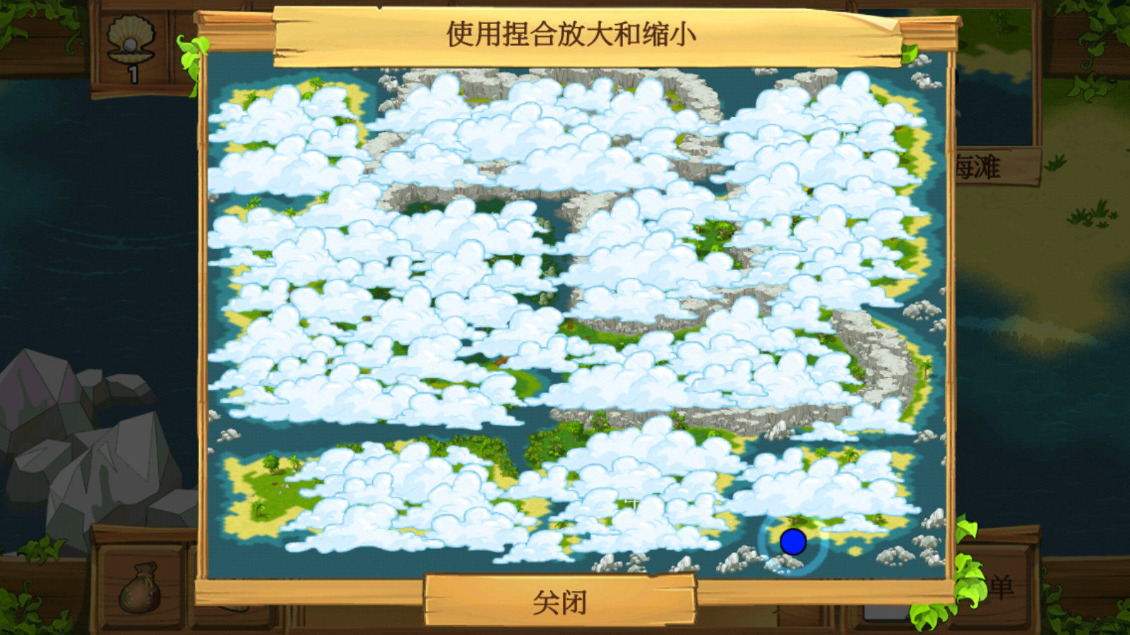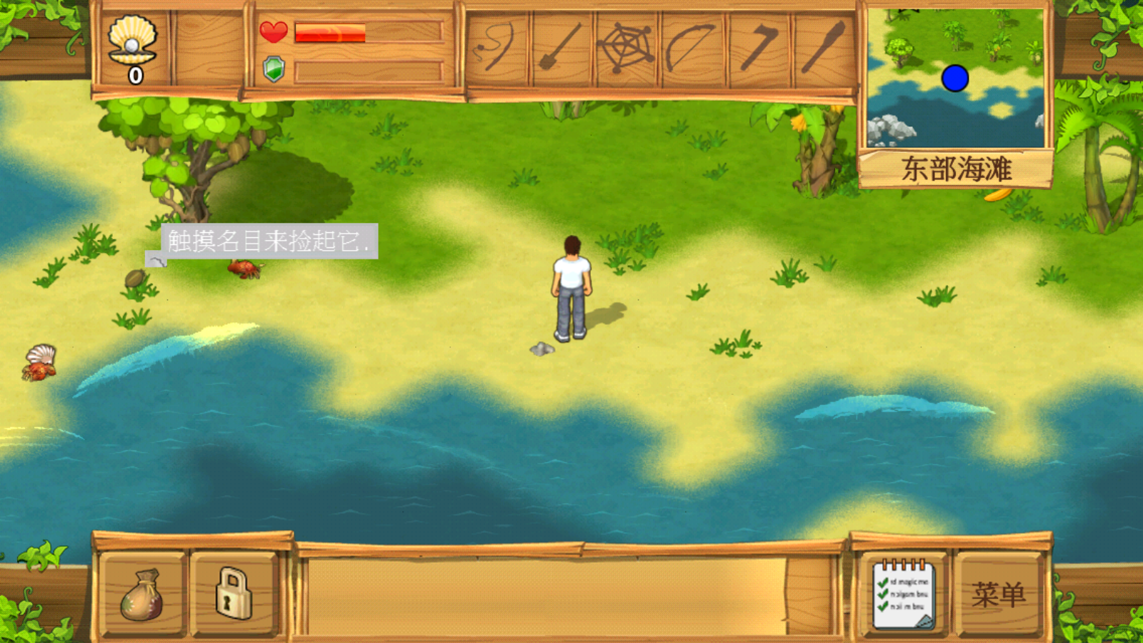 提示:首先要找到一个扎营的地方,在地图的左上侧位置。然后去找木棍,木棍、原木、贝壳刀、珍珠、绳子等材料都可以在海边找到,这些东西基本都出现海岸线附近。