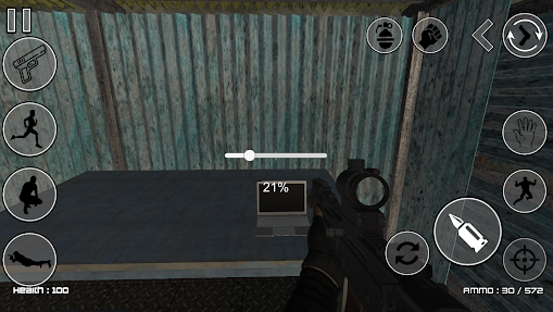 1、间谍前线游戏中,拖动左侧屏幕控制移动,左侧还有各种行动指令,如奔跑、蹲伏、匍匐。